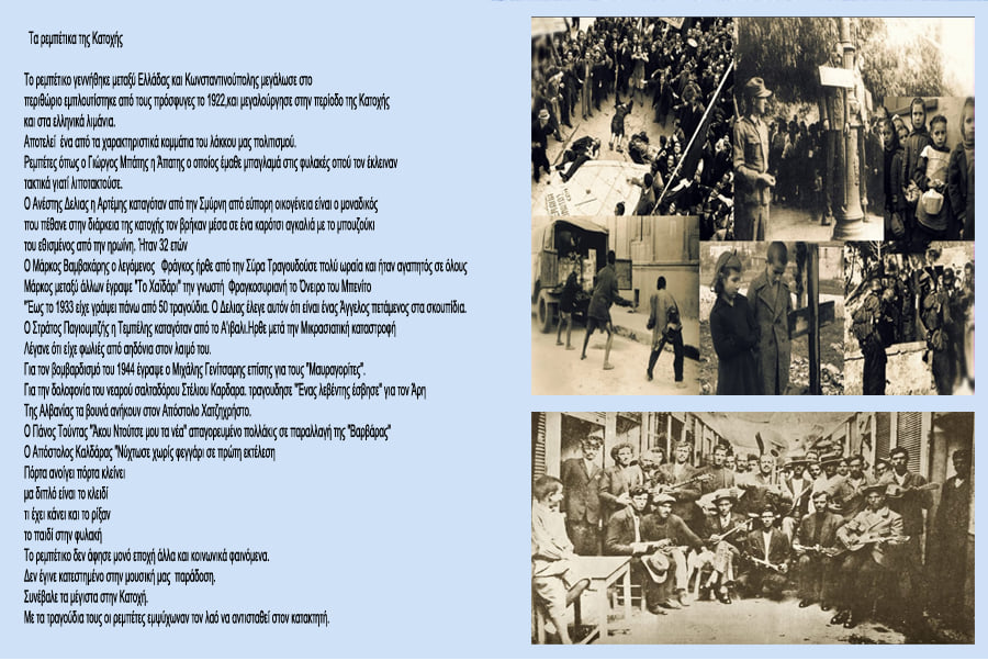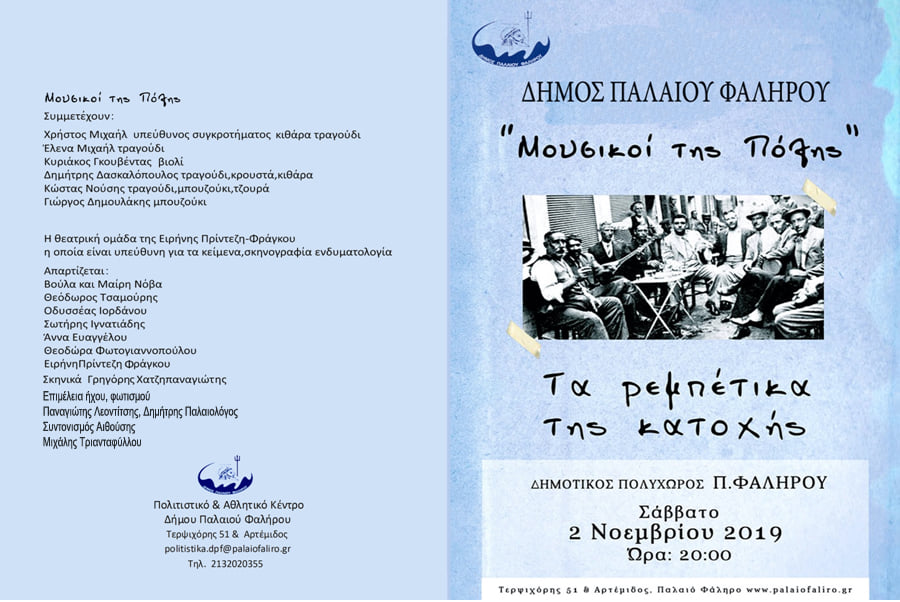 Με τίτλο «Τα ρεμπέτικα της κατοχής» οι «Μουσικοί της πόλης» και η θεατρική ομάδα της Ειρήνης Πρίντεζη – Φράγκου και με σκηνικό μια ταβέρνα σε μια γειτονιά της Αθήνας μας ταξίδεψαν μουσικά πίσω στο χρόνο στα δύσκολα χρόνια της κατοχής και της αντίστασης.