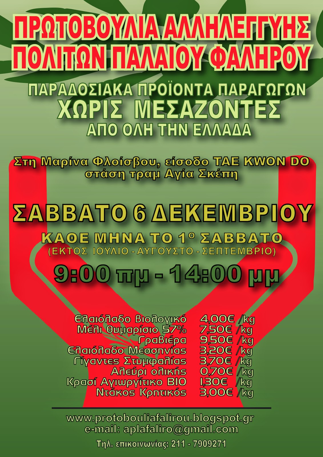 deltio paraggelias pappf-1-1Το Σάββατο 6 Δεκεμβρίου 2014, 9:00πμ – 14:00μμ , η πρωτοβουλία αλληλεγγύης πολιτών Π. Φαλήρου σας περιμένει στο καθιερωμένο χώρο,έξω από την είσοδο του Ταε-Κβο-Ντο (στάση τραμ Αγία Σκέπη – μαρίνα Φλοίσβου).