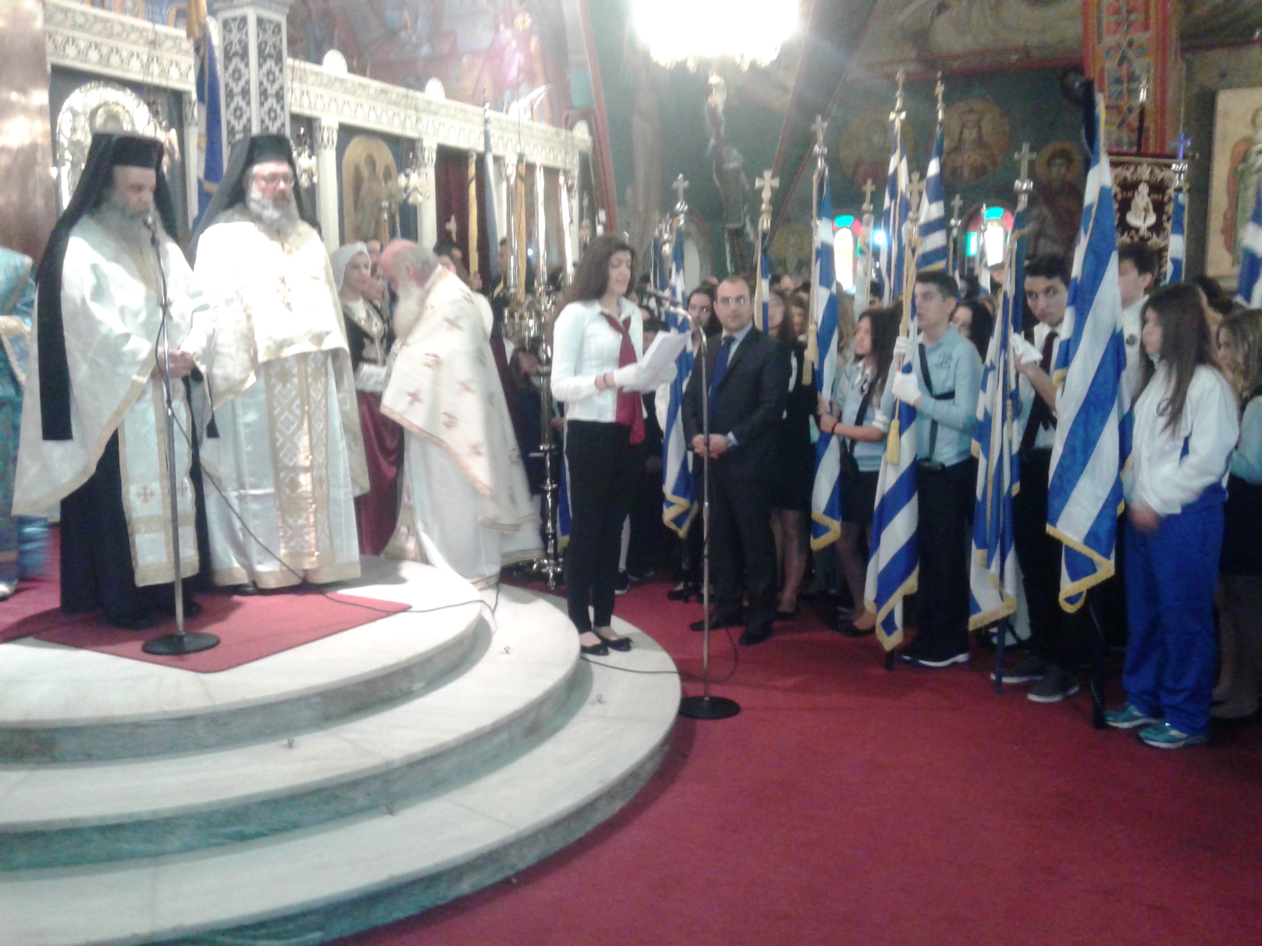 Δοξολογία στον «Άγιο Αλέξανδρο» και εκφώνηση του πανηγυρικού της ημέρας από την Ντόκου Ευαγγελία, μαθήτρια της Γ΄ τάξης, του 1ου Γενικού Λυκείου Π. Φαλήρου,