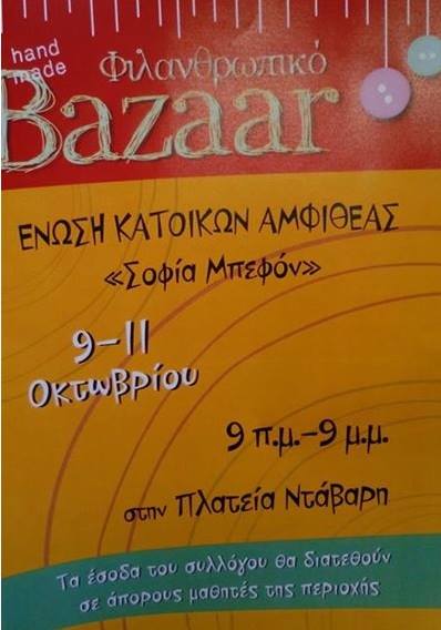 Η ένωση κατοίκων Αμφιθέας «Σοφία Μπεφόν» διοργανώνει για άλλη μια φορά ανοιχτό φθινοπωρινό φιλανθρωπικό Βazaar  στην πλατεία Ντάβαρη! Από 9 – 11 Οκτωβρίου και για τρεις ημέρες  (9πμ. – 10μμ) υπέροχοι πάγκοι με χειροποίητες δημιουργίες μας περιμένουν , με πολλά  χειροποίητα δημιουργήματα όπως κοσμήματα, διακοσμητικά, ρούχα, σαπούνια, γλυκά και πολλά άλλα!!