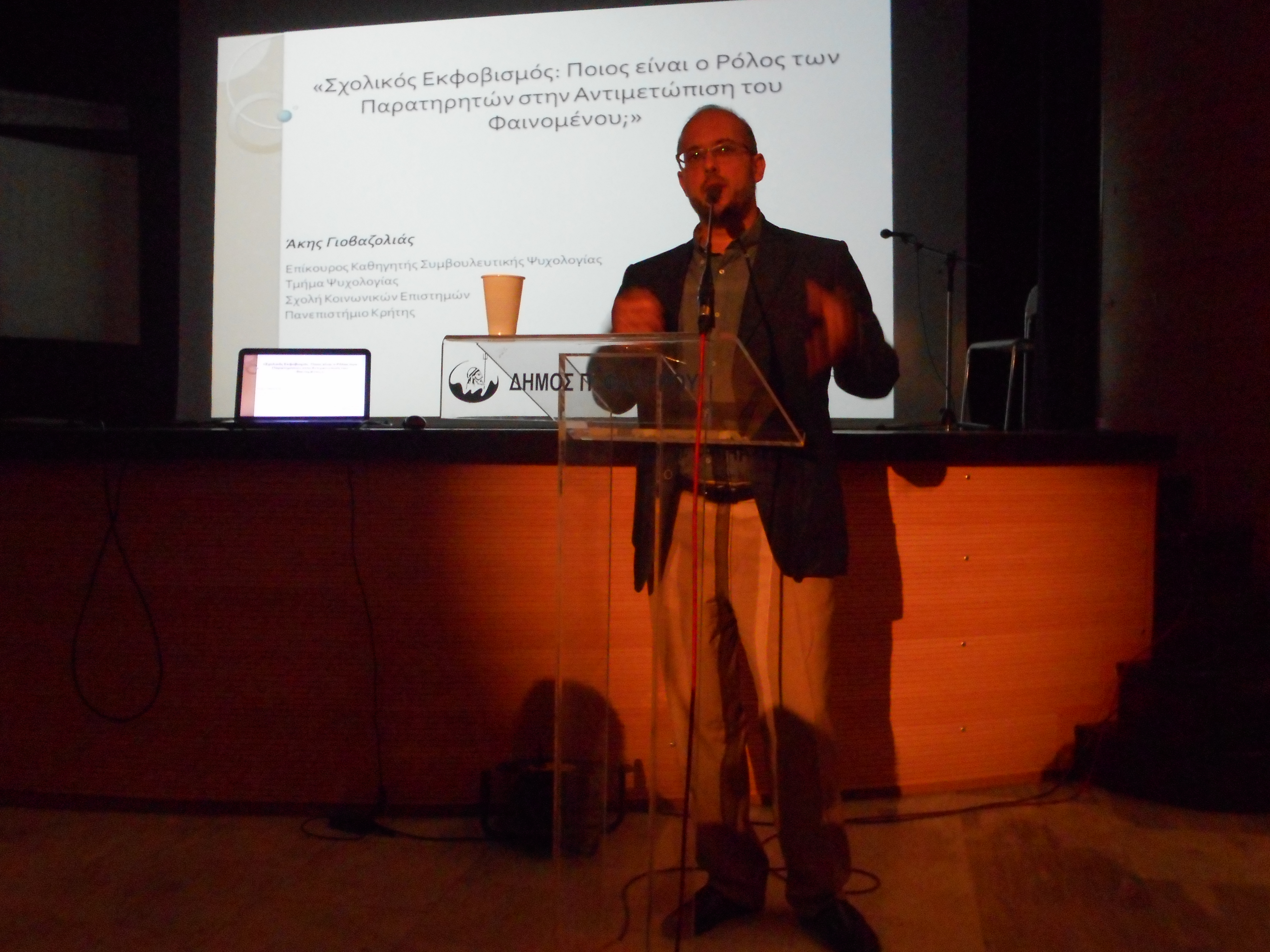 • Οµιλία µε τίτλο : “Σχολικός Εκφοβισµός : Ποιος είναι ο ρόλος των παρισταµένων στην αντιµετώπιση του φαινοµένου; ”από τον κ. ΄Ακη Γιοβαζολιά,Επίκουρο καθηγητή Συµβουλευτικής Ψυχολογίας, τµήµα Ψυχολογίας Παν/µίου Κρήτης.