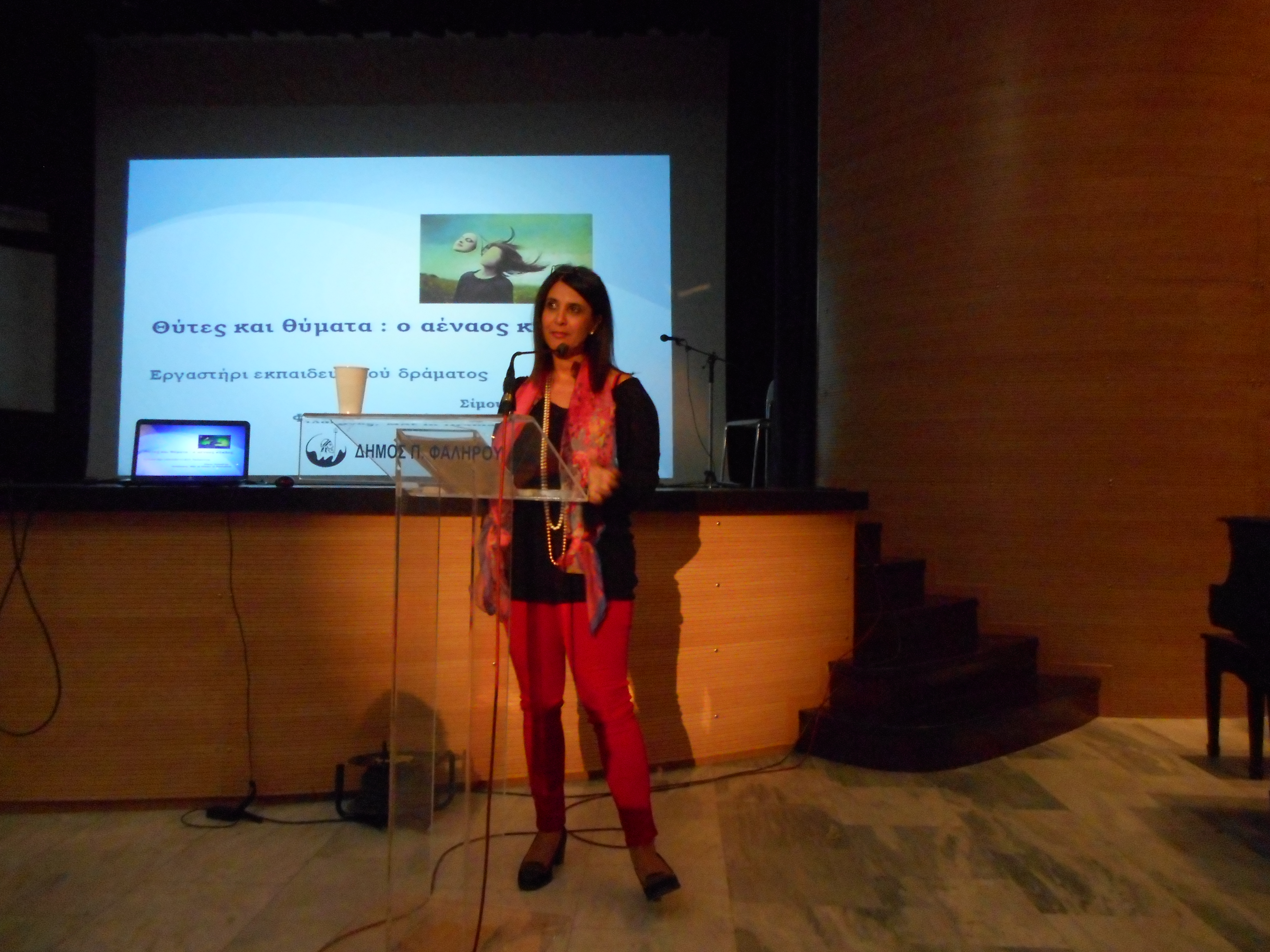 • Το 4ο Γενικό Λύκειο Π. Φαλήρου. Η κ. Πολυξένη Σίμου καθηγήτρια φιλόλογος με μεταπτυχιακές σπουδές στο «Drama in Education» έστησε στο χώρο του σχολείου το απόγευμα της Τετάρτης 23-9-2015 ένα θεατρικό εργαστήρι για ενήλικες, με θέμα «Θύτες & Θύµατα , ο αέναος κύκλος», όπου οι συμμετέχοντες (20 περίπου άτομα) είχαν την ευκαιρία μέσα από τεχνικές θεάτρου, αυτοσχεδιασμούς και παιχνίδια ρόλων να εξερευνήσουν το ζήτημα του εκφοβισμού στις ανθρώπινες σχέσεις. Στη χθεσινή εκδήλωση η κ. Σίμου παρουσίασε τα αποτελέσματα και τα συμπεράσματα που προέκυψαν από το εργαστήρι εκπαιδευτικού δράματος και το πως αυτό βοήθησε τους συμμετέχοντες να αντιληφθούν το πρόβλημα από διαφορετικές οπτικές γωνίες και πως η επίλυση θεμάτων εκφοβισμού σχετίζεται και προϋποθέτει την ύπαρξη ισότητας των φύλων.